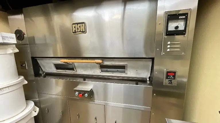 The space is FULLY EQUIPPED with restaurant equipment valued at over $100,000, allowing a new operator to take over quickly while avoiding significant startup costs. Kitchen equipment includes a P-1040 four-shelf rotating pizza oven with heat hood (original cost with install over $100k), a 10-foot hood system with Ansul, an Atosa two-door upright freezer and matching two-door upright refrigerator, two Cookrite deep fryers, a Cookrite salamander, a six-burner stovetop with oven, a chargrill with stainless steel table, a commercial microwave, food warmer, soup warmer, chest freezer, four-tap keg cooler, and a single-door upright dessert display case. Prep and storage are well supported with multiple refrigerated prep coolers, a dough mixer, Hobart slicer, Chefmate slicer, extensive stainless steel tables (fixed and on wheels), wire shelving, rolling carts, dough trays, and dry storage bins.