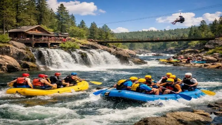 • 95+ acre retreat featuring 4,200 feet of private river frontage with 42 years of top-rated Class II-III guided rafting experience