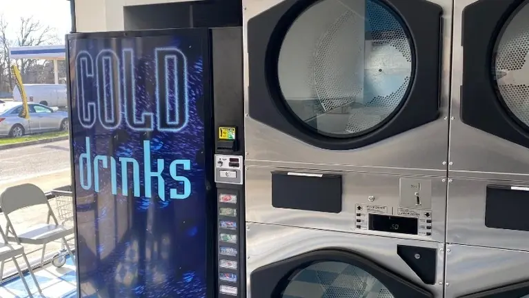 - New Maytag machines purchased in 2022. Also included are all folding tables, chairs, TV, laundry carts, soap dispenser, bill changer, and cold soda vending machine. Space includes employee area with storage, 2 single stall bathrooms, and storage area behind machines. Turn key!