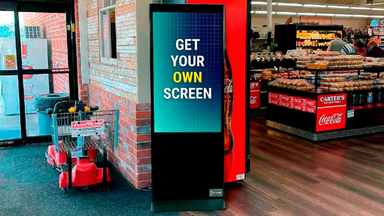 - Assets include commercial-grade 49” digital indoor billboards installed inside grocery store locations, with 9 active sites in Texas. Each display features 1080 x 1920 resolution (portrait) and anti-glare screens designed for bright retail environments to ensure optimal visibility.