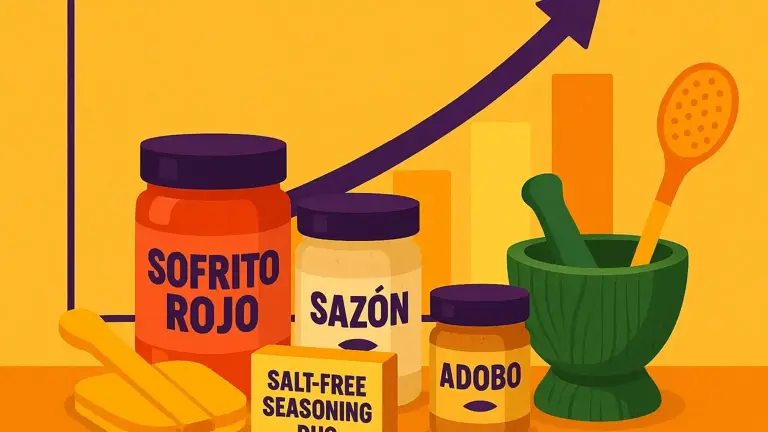 The storefront includes bestsellers like the Tostonera Plantain Press, Latin cooking utensils, and multiple seasoning blends with organic certification. All products align with clean-label trends: no MSG, preservatives, or artificial coloring.