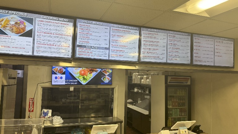 - Rotisserie: High-efficiency rotisserie for cooking our signature dishes. 2 Shawarma Machines: Perfect for making our delicious shawarma. 1 Walk-in Refrigerator: Large enough to store ingredients and keep everything fresh. 2 Freezers: Ample storage for frozen items and stock. Grill: A versatile cooking space for preparing meats and vegetables. Large Kitchen: Spacious and fully functional kitchen with plenty of room for staff. 38 Seating: Comfortable seating arrangement for guests, ideal for a cozy dining experience.