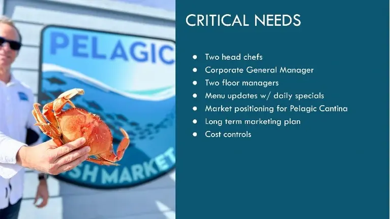 While the foundation is strong, leadership bandwidth has limited recent expansion. The core operations are proven, but there is clear room for revitalization through culinary refresh, elevated daily specials programming, refined cost controls, stronger management structure, and targeted marketing to Bay Area visitors and private event clientele. Pelagic Cantina presents additional positioning potential as a distinct draw within the harbor footprint.
