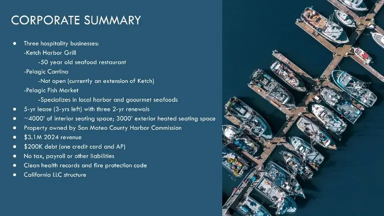 - Three integrated harbor-front businesses totaling ~7,000 SF (4,000 interior + 3,000 heated patio). Includes full commercial kitchen, secondary prep kitchen, two bars with ABC license & bottle sales, private event space for 120 (booked into 2026), and all FF&E. Rare CA Fish & Wildlife license allows direct boat purchases (~20% lower cost). 50-year legacy location with ample parking, 24/7 security. 3 years remaining on lease + options.