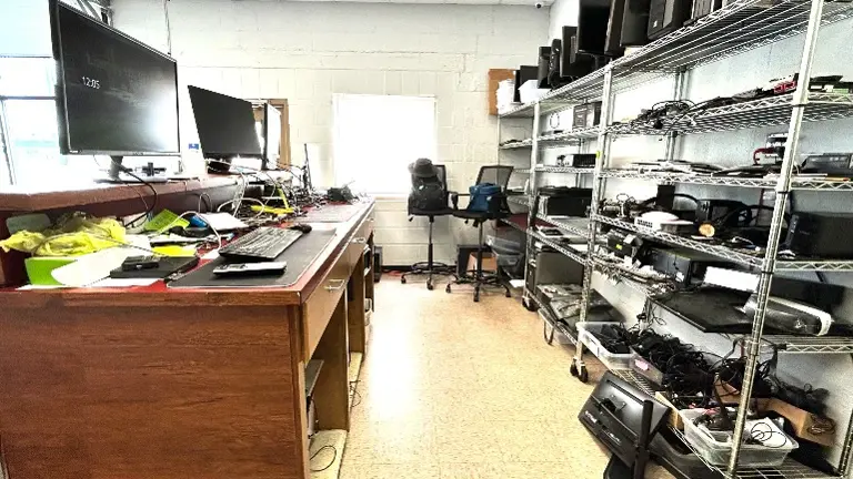 cases, chairs, servers, network and security cameras, racks for systems and storage, plus