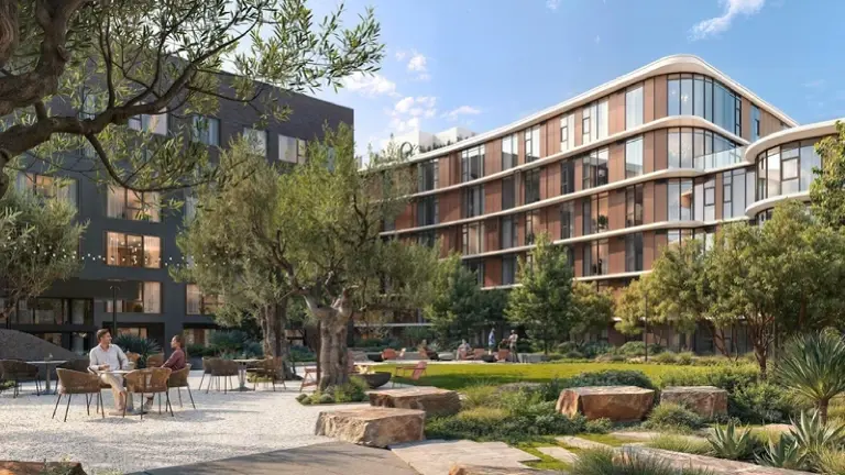 The eight-story development, which features studios, one-, two- and three-bedroom apartments, includes more than 67,000 square feet of amenity space, a 60,000-square-foot upscale grocery store and a 34,000-square-foot Equinox Fitness Club. The project also incorporates a nearly three-quarter-acre private park on the third floor.