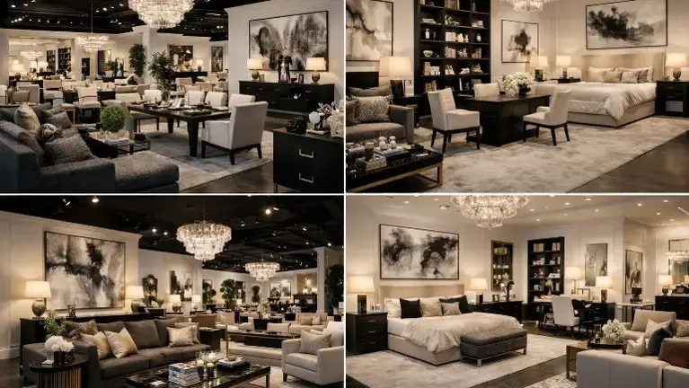 The showroom presents a turnkey opportunity for an operator seeking immediate entry into the luxury home furnishings market. The space has been thoughtfully designed to reflect a modern European aesthetic, featuring elegant cream-toned walls, dramatic ceiling treatments, designer lighting, and carefully merchandised lifestyle vignettes that create an immersive shopping experience for clientele.