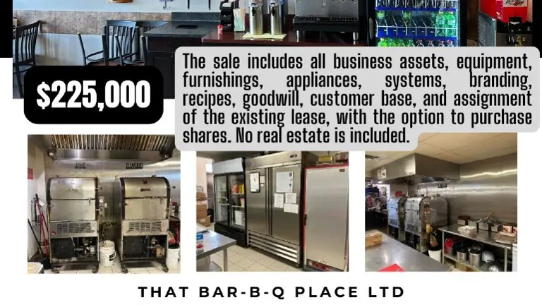 The sale includes ALL BUSINESS ASSETS, EQUIPMENT, FURNISHINGS, APPLIANCES, SYSTEMS, BRANDING, RECIPES, GOODWILL, CUSTOMER BASE, ASSIGNMENT OF THE LESSEE INTEREST IN A LEASE AGREEMENT BETWEEN MILLENIUM RIDGE DEVELOPMENTS LTD. AND THAT BAR-B-Q- PLACE LTD.; AND/OR THE SHARES IN THE CORPORATION OF THAT BAR-B-Q PLACE LTD.