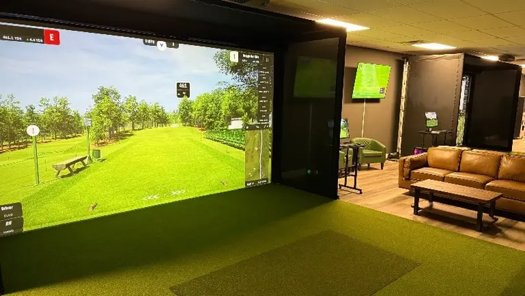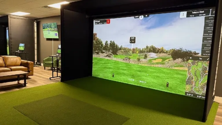 The facility is fully built out and includes two simulator bays, impact screens, projection systems, turf hitting areas, and lounge space for members and guests. The layout was designed specifically for indoor simulator play and allows customers to enjoy a comfortable year-round golf experience.