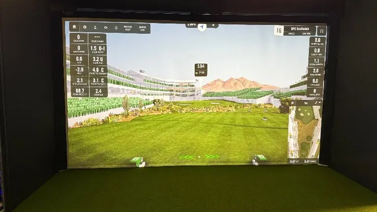 - The business operates from a leased commercial space fully built out for an indoor golf simulator facility. The layout includes two simulator bays, turf hitting areas, impact screens, projection systems, and a lounge area.