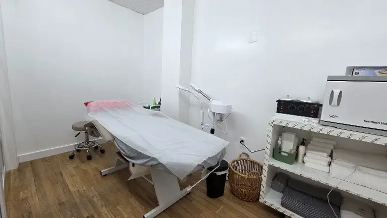Beauty setup includes threading chair, facial/waxing equipment, and private service room.