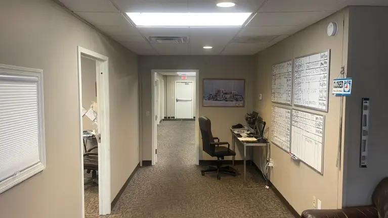 The facilities include a spacious office building, with several rooms and a reception area. Also, included are restrooms and a kitchen.