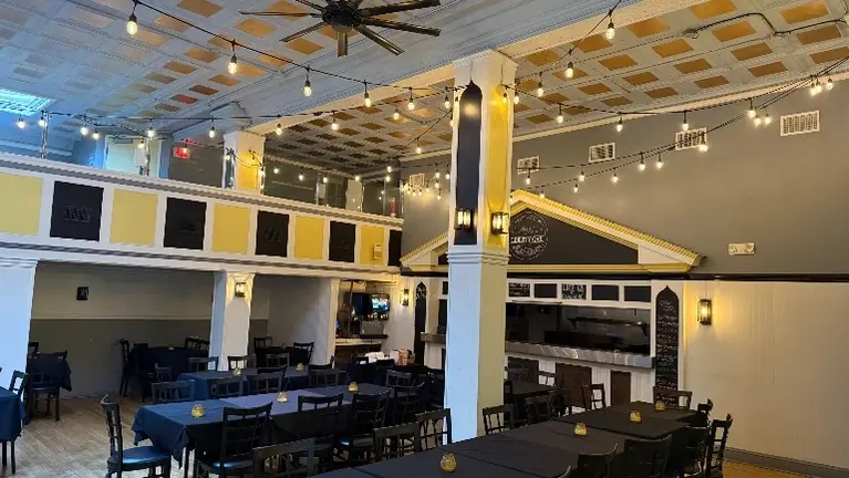 • Existing commercial kitchen infrastructure including hood system, grease trap, and bar area