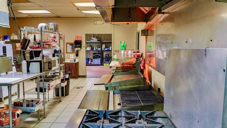Refrigerated Prep Table; 2 Fryers; Flat Top Griddle; Open Flame Grill (purchased new in 2024); Pizza Oven, 6-Burner Gas Cook Top; Popcorn Machine; 2 Chest Style Freezers; Full Walk-in Cooler; 2 Microwaves; 12 ft, Venthood; Prep-Table & Racks; Large Commercial Dishwashing Station w/ Dishwasher & Compartments Sinks