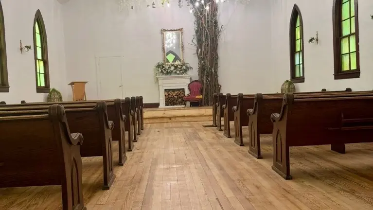 - Full basement, water, heat, a/c, original hardwood floors, pews, decorations, and land to build a reception hall.